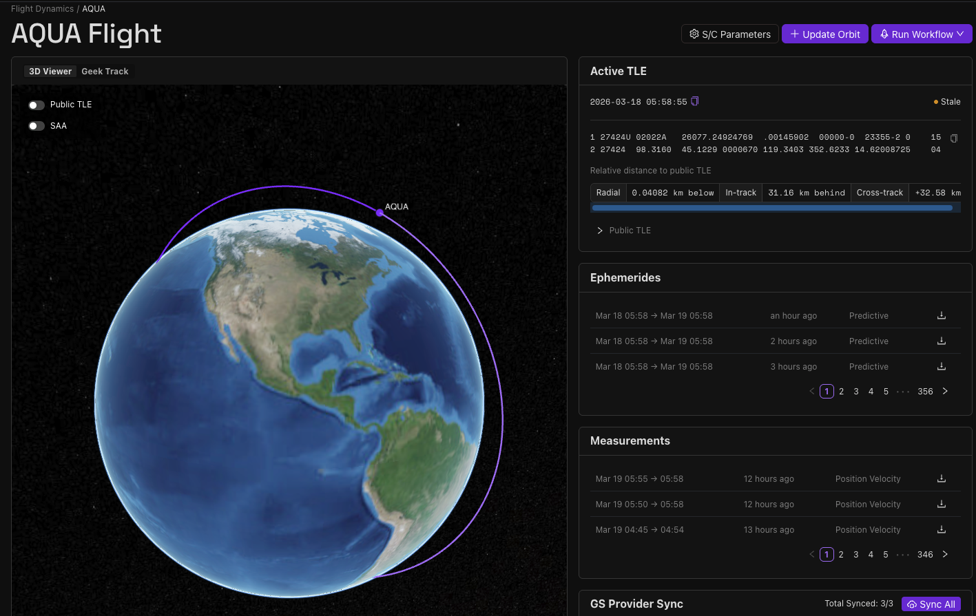 With the redesigned Flight Dynamics module, Orbit Determination, Propagation, and TLE Management now live in a single, consolidated experience. Operators can review flight dynamics data for each individual spacecraft, with clear visibility into TLE epoch age, recency, and sync status.